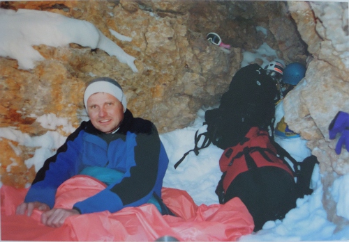 … mlha nám zaslepuje oči a sněhová bouřka nutí k ústupu. Ještě jedno slanění a vidíme světlo štoly, jen se ještě do ní bezpečně dostat… s Honzou Horákem poznáváme jak snadno a rychle se umí v takové stěně pokazit počasí…