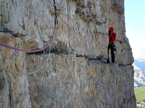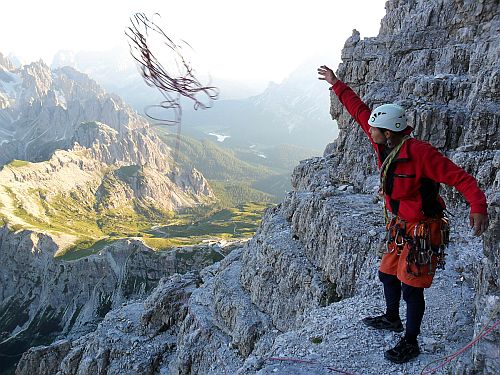 Probouzíme se do slunečného dne a po hodinovém pochodu stojíme před 200 metrovou skalní stěnou Corda Negra v oblasti Nuvolau. Michal vybírá pěknou rozehřívací cestu ( Anello sos petto, 6- ). Rozhoduji se, že jí polezu sólo, abych nezdržoval postup ostatních. Pouštím si hudbu z empétrojky a jdu na to. První délka za 4+ člověka pěkně probudí. Následuje klíčový 6-kový úsek, kde už se musí trochu lézt. Až mě překvapuje, s jakým klidem ho přelézám. Dále je to asi 100 metrů pětkovým terénem na vrchol. Nenahraditelný pocit (něco na tom je, že Alexi?). Celkový čas výstupu – něco přes deset minut. Když slaňuji (měl jsem s sebou 50 metrů 7mm repky) Michal s Dančou zrovna opouštějí první štand, takže mám dole chvíli volna.  Další cesta ( Elisabetta, 7- ) má nejtěžší délku hned tu první, takže se domlouváme, že jí vylezu nejdříve já, pak se odvážu a budu pokračovat sám. Ostatní jí půjdou v lanovém družstvu. Hned ze začátku mi něco nesedí. Tohle přece není 7-. Vždyť jsou všude chyty! Na štandu hodím lano dolů a pokračuji dál veden nýty. Když se terén začne naklánět, dojde mi, že jsme asi o cestu jinde. Sakra. Co teď? Dolů se mi nechce, a tak si na sedák cvakám dvě smyčky a lezu s přecvakáváním. Obtíže této délky byly, jak jsem se později dozvěděl z průvodce, 7-. Při přelézání nejtěžšího místa mám v hlavě úplné prázdno. Myslím jen na chyty a svůj dech. Stoprocentně se koncentruji. Povedlo se. Jsem nad převisem a traverzuji do původně zamýšlené cesty, kde už je to samá pětka a čtverka, takže je vše v oukeji. Po dolezení cesty se mi vybaví článek z Montany o testování pevnosti šitých smyček…
