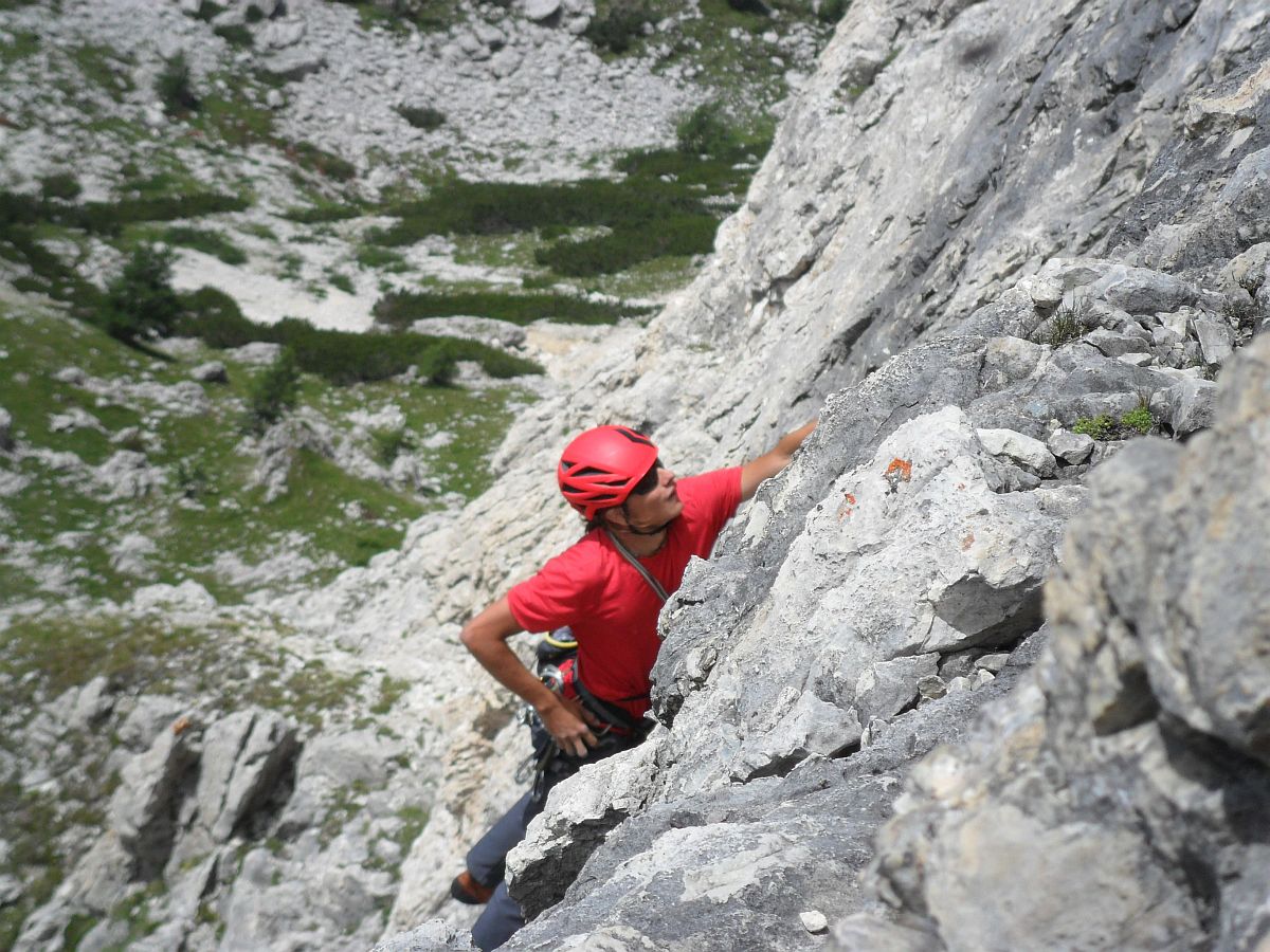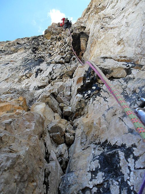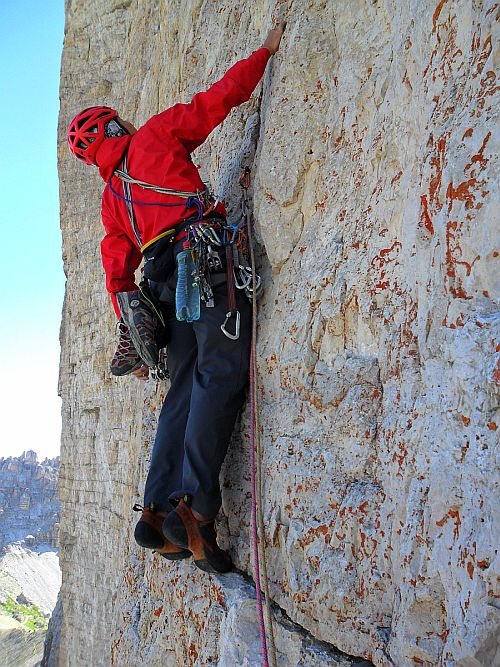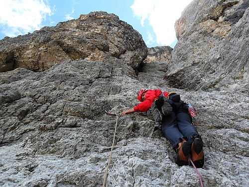 Skvěle rozlezení se druhý den pouštíme do hlavního questu – Hasse Brandler, 8 + neboli diretisima severní stěny Cimy Grande byla vylezena už v roce 1958, a tak si říkáme, že když to kluci vylezli ještě snad s konopnými lany a v bačkorách, tak mi to musíme zvládnout taky. Nejhorší na této cestě je fakt, že nejtěžší délky přijdou až v půlce a to už za sebou máte dost sedmičkového lezení. První metry jsou rozehřívací (zvláště Jirkova neskutečně rozbitá pětková délka, v níž jsem se na něj při jištění ani nemohl dívat, jak jsem se bál, že pošle do údolí asi dva náklaďáky kamení).