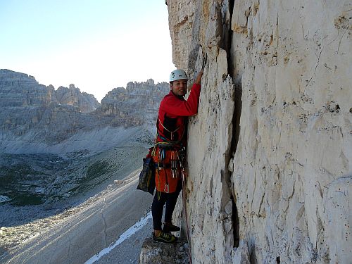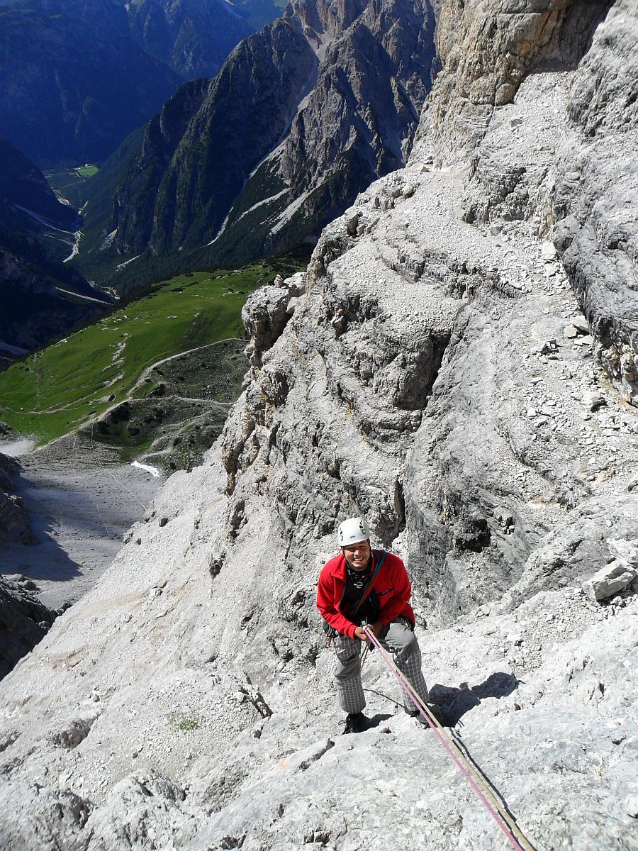Jako první cestu vybírám Cassina ,8- na Cimu Ovest . Cesta je to velice známá a proslulá hlavně svým 60ti metrovým „grande traverso“, který je z celé cesty nejtěžší. Nalézáme jako druhá dvojka, ale po zahřívacích pětkových délkách, které přebíháme celkem na pohodu, nás borci pouští před sebe. Jelikož letos volíme taktiku „super lajt“ a lezeme bez batohu (jen s pitím a botami u pasu), jsme před klíčem vcelku čerství a můžeme se do něj pustit. První lezu já. Snažím se lézt rychle a efektivně. Ani nestíhám cvakat všechny skoby a už sedím na štandu a dobírám spolulezce. Jirka leze druhou, podle topa stejně obtížnou, v reálu však těžší délku. Borec v ní bojuje a funí o sto šest. Bohužel si musí párkrát odsednout. Já jsem ale rozhodnut přelézt vše čistě a bez odsedu, a tak do toho naburácím a naštěstí se mi všechny ty titěrné lištičky daří udržet a nespadnout. Dále nás čekají ještě dvě délky za sedm, které jsou také dost vypečené a člověk v nich musí zapojit jednak sílu předloktí, tak i mozek. Zbytek cesty probíhá v duchu - tudy by to šlo, tak lezem. Patnáct metrů odlez, skoba a zase patnáct metrů lezení. Kolem třetí už vysedáváme u (ne na ) vrcholového kříže a čeká nás jen nekonečný sestup dolů, na jehož konci je kýžená voda, jídlo a odpočinek.
