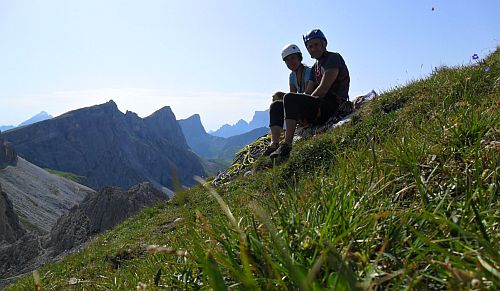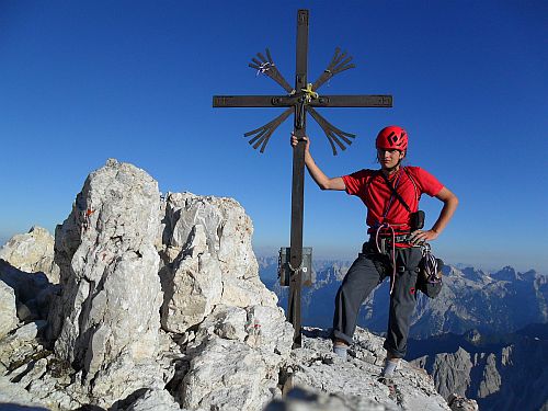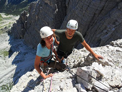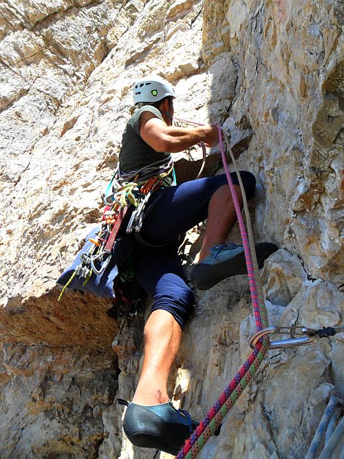 Mezitím na mě zbytek týmu čeká dole (zas tak dlouho ne, asi deset minut) a společně lezeme předem vybranou Elisabettu. Na štandech se střídáme, a tak to trvá celkem dlouho. Nahoře ještě ukecávám Michala, aby se mnou slanil a přelezl poslední délku té mé omylem lezené cesty, která je psaná za 8/8+ ( Via Centrale ). Začíná kolmou stěnkou po dobrých chytech. Pak je dobrý rest a následuje převislá plotna se škrabkami a klíčovým krokem přes jednoprdu. Dále už linka jen lehkne. Dílo se zadařilo a onsajt je doma. Pak už všichni naposledy slaňujeme, balíme věci a jdeme zpátky k autu.