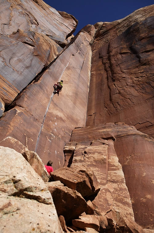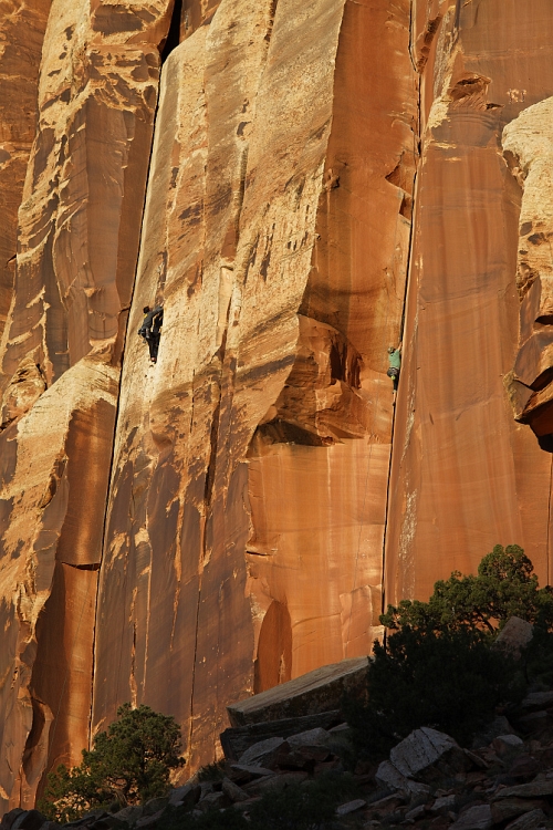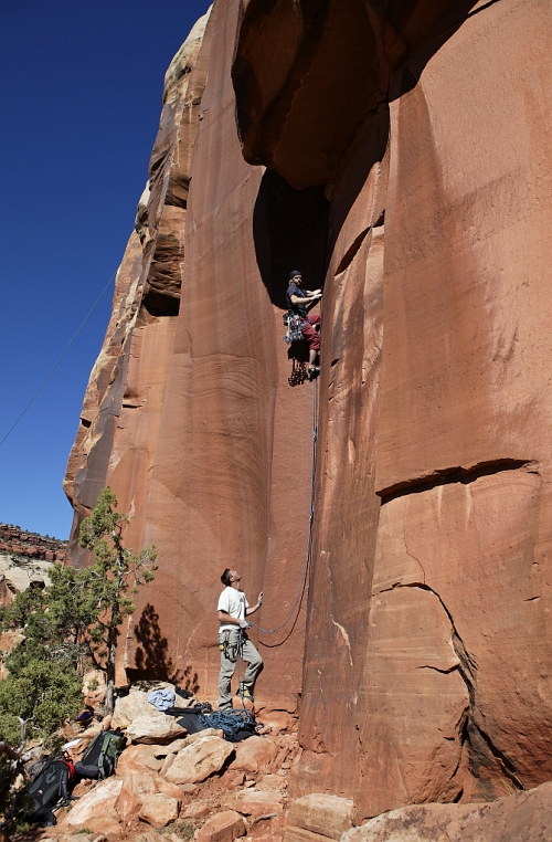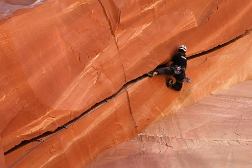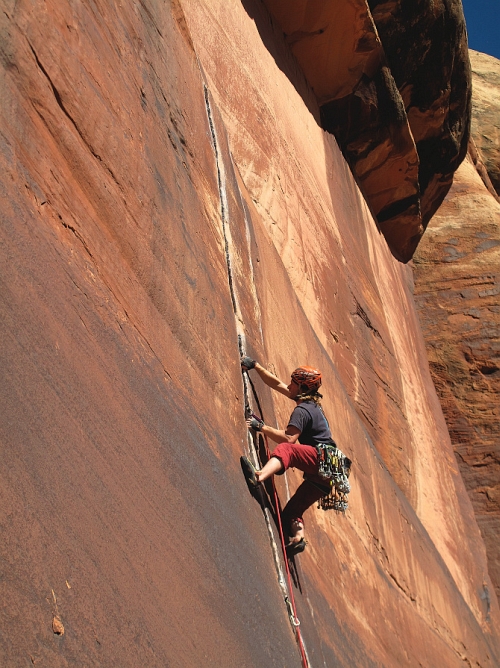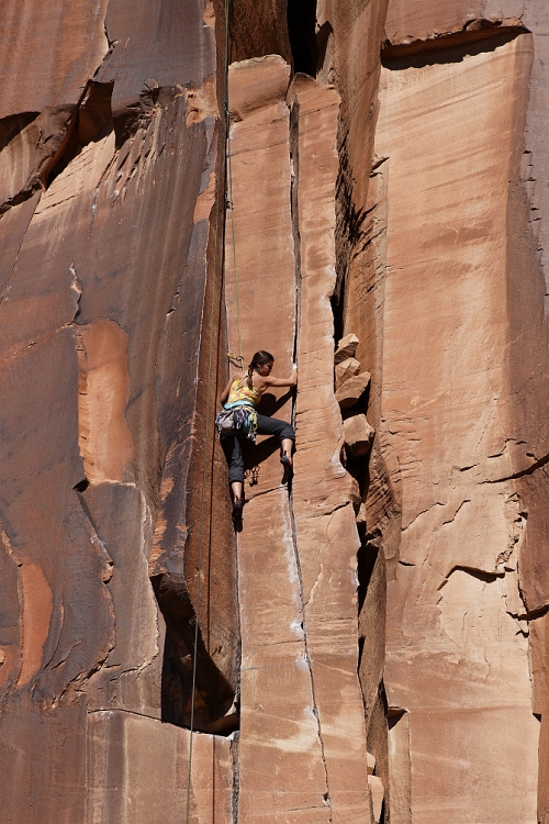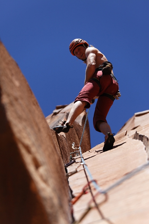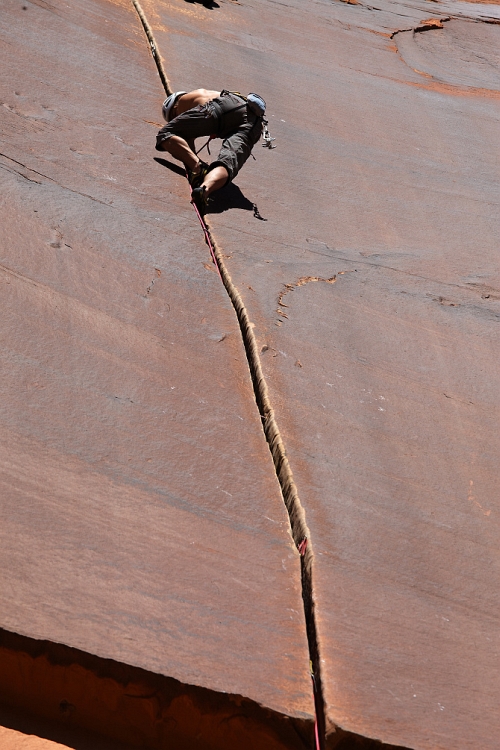 Zdomácnět v materiálu a stát se medvědem trvá první tři dny za který stíháme dát spoustu klasik s papírově legrační klasifikací kolem 5.10, pod kterýma se ale klepou kolena při pohledu vzhůru posvátnou hrůzou. Supercrack, Incredible Crack, Gorila , všechno doteky historie amerického lezení. Ono se v sedmdesátých letech když to tady začalo, ještě s klasifikací asi dost šetřilo...