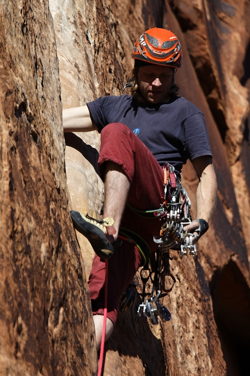 Se splasklýma prstama i nohama je lezení s tím co víme už jiná liga, takže se dostáváme konečně do pohody a začíná to vypadat tak jak má. Z frendu je konečně kruh, kterej si dáš kam ty chceš a cesty si vybíráme od pohledu a ne jen podle klasy. Na dřinu jak při skládání vagónů si tělo zvyká rychle, psycho jde o krok nazpátek, sice pomalu, ale jistě. Ne že by se výkony zvedly skokově jinam, ale lezeme už v domácí oblasti a to je znát. Vychutnáváme si další pecky teď už s pocity místňáků a to je víc než boj o čísla, co tu stejně nemá smysl. Závěr v Creeku užíváme v dalším sektoru z desítek, co ještě neznáme a z lezení se stává extáze. Po poslední cestě dne mi Šatavis drze do ksichtu říká, že nebejt toho, že byla dole ta kočka z průvodce, co sázela 5.12ky jednu za druhou, nikdy bych to v onsajtu nedal (měl pravdu) a já jdu ze skal jak zmlácenej, přesto s hubou od ucha k uchu. Třetina výletu je v kýblu a je načase vymáznout dál ... Nikdy bych nevěřil, že mě tyhle blbý trhliny tak dostanou.
