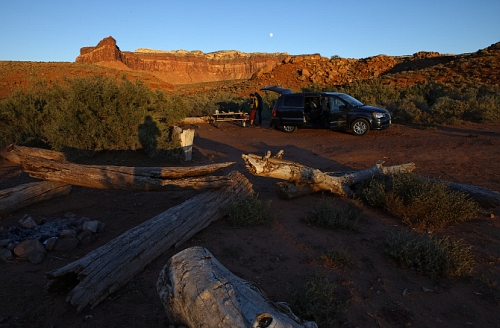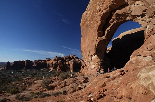 Když už se člověk orosí už jen při představě cpaní věčně omačkaných nohou do lezeček a podívá se s leknutím na svoje ruce, je potřeba vyhlásit pauzu. Z údolí je to do nejbližší civilizace dobrých 50 mil, takže každá záminka je vhodná na doplnění vody, zásob jídla a wifiny v Moabu. Kousek vedle je národní park Archees , takže naleštit objektivy do Canonu, a hurá na výlet. Kombinace super přírody a davů amíků okolo. Parádní skalní mosty všude kolem nás dostávají, jak od pohledu tak fyzicky, procházíme za dvě hodiny kousíček z mapy a dál už jezdíme jen autem. Dojíždíme na úplně prázdné parkoviště, pěkně po americku koukáme oknem na panorama (pěkně hotoví z toho dnešního odpočinku) a Tomáš mi velí couvnout dva metry, protože mu křoví leze do záběru. Šoupu do automatu zpátečku a křáp ho, už jsem v džípu co mi mezitím zaparkoval za prdelí... Doprkna, úplně prázdnej parkáč a on se za mnou táhne jak smrad. Omlouvám se týpkovi a okukujem rozsah škod – naštěstí jen promáčklej zadní nárazník. Psychicky i fyzicky dokonale odpočatí se vracíme do klidu Super Bowlu.