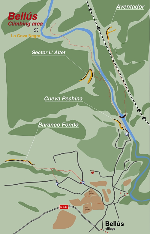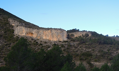 Hned na sever od malé ospalé vesnice Bellús, tam kde se silnice N 340 stáčí doleva, aby se obloukem vyhnula oblým kopcům, se nacházejí moc pěkné skály.