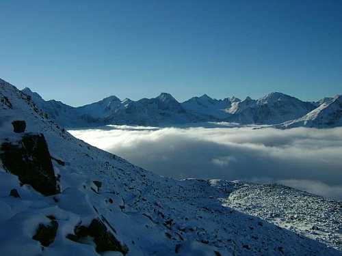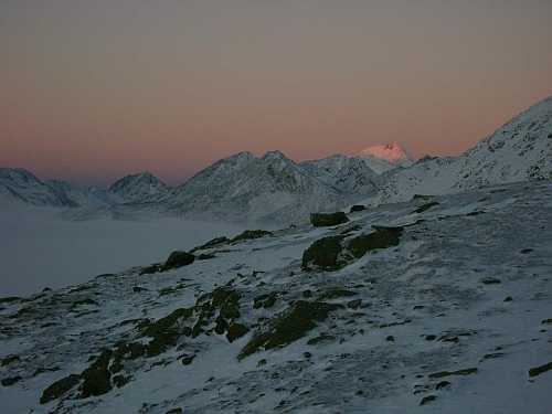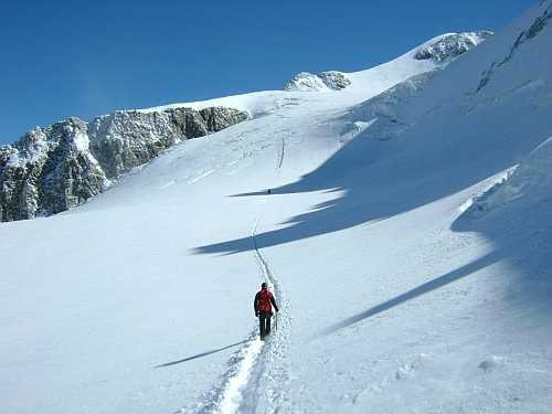 Po sedmé hodině dorážíme na chatu a v šeru zasedáme za stůl, vyndáváme lovečák a chleba. Horští vůdci mezitím se svými skupinami vyráží na Wildspitzi. Jak se později ukázalo, vyrazit za nimi byl skvělý nápad, jelikož jsme ve sněhu lehce našli cestu kudy jít  Po rychlé snídani vyrážíme dál a během krásného, jasného světla stoupáme pod Wildspitzi. Počasí je nádherné a my se neustále musíme kochat výhledy na okolní zasněžené vrcholky, které se tyčí nad mraky ležícími v údolí. Díky zasněženým horám si člověk připadá jako v Himalájích a ne v Alpách, tento pocit se ještě umocňuje, když se kousek nad chatou naše pohledy konečně zastaví na Wildspitze. Je to skutečně krásná hora a z jižní strany od Breslauer Hutte vypadá jako K2. Pohled na naší malou K2 si užíváme jen do chvíle, než si uvědomíme, že na tenhle vrchol vlastně musíme vystoupit i když je to sakra výška. Poměrně dlouho se táhneme mezi hřebeny pod Wildspitzí, až dojdeme pod sedlo Mitterkarjoch.