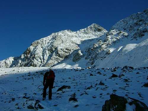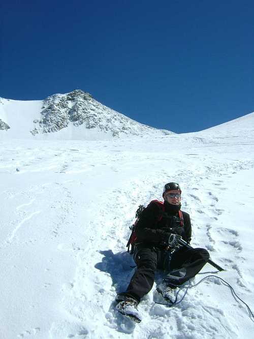 Na ledovci jsme samozřejmě navázání byli, mačky vzhledem k čerstvému sněhu nebyly třeba. Lano a mačky jsme nechali pod hřebenem, který je v podstatě jen skála, jen kvůli tomu že napadl sníh tam bylo jedno uklozaný místo , kde by se mačky hodily... a když jsme viděli, že všichni nechávaj bagáž pod skálo, nechali jsme taky :)