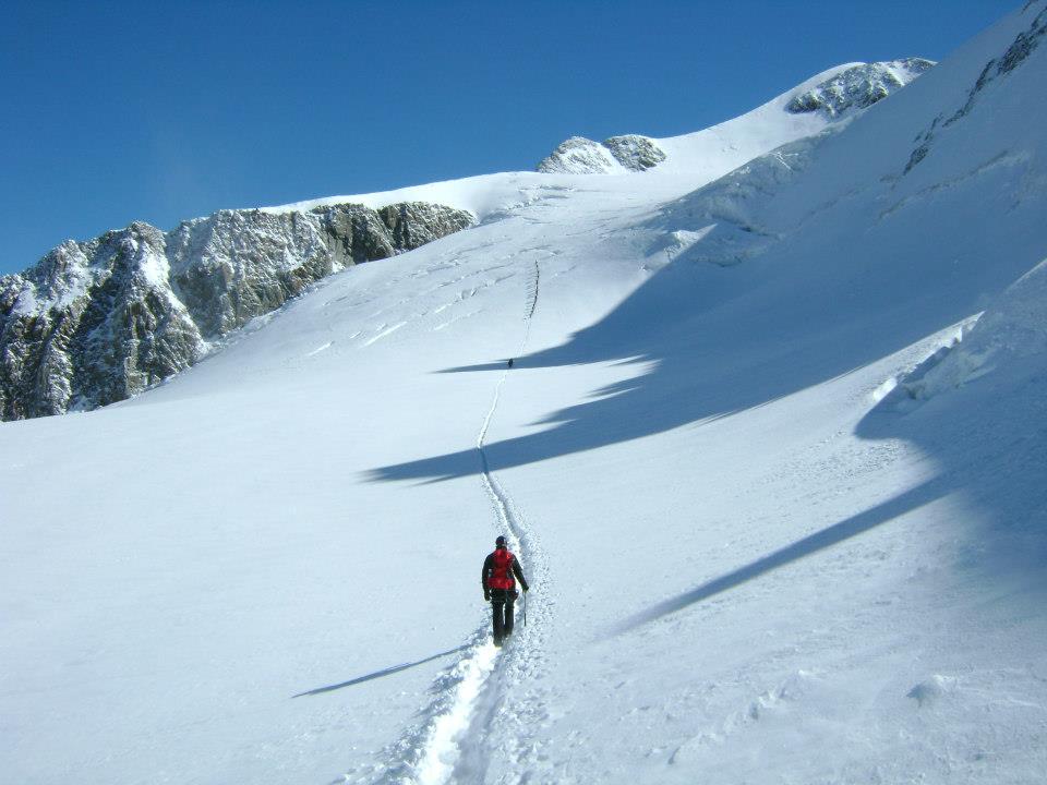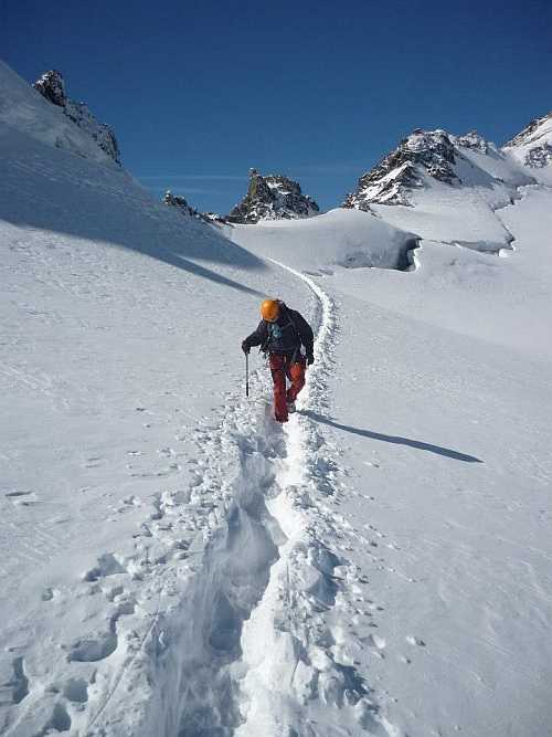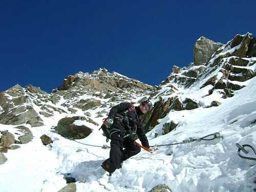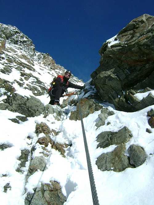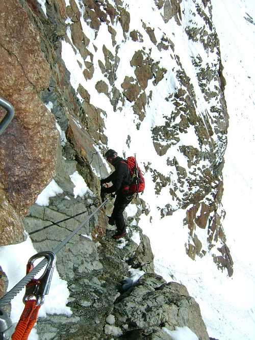 Zde docházíme dvě skupiny s vůdcem, jenomže do sedla se leze po malém ledovci na fixních lanech a následně po skále za pomocí ferraty, skupinky s průvodcem se v místech pod lany začínají štosovat. Protože nechceme čekat na strmém svahu pod skalnatým úsekem a dále se zbytečně zdržovat na  ferratě, čekáme asi 150 metrů od nástupu na velkých kamenech, abychom nestáli zbytečně ve vysokém sněhu. Obě početné skupiny nás zdrží asi na 40 minut, přitom začínáme být trošku rozpačití z pomalého tempa skupinek před námi. Dáváme si na čas i potom co se odpoutají z ferraty a pokračují vedle skály vzhůru. Když nám poslední člen skupiny zmizí z dohledu, začínáme stoupat ke skále přičemž hlubokém sněhu dá strmý svah celkem zabrat a tak jsme rádi, když za chvíli nastupujeme na ferratu. I když je skála zasněžená, bez problémů lezem výše.  Asi 40 metrů pod sedlem, lana mizí pod sněhem, takže odbočujeme ze skály do kuloáru a s cepínem se probíjíme v hlubokém sněhu k sedlu. Přestože nám nebezpečí nehrozí, vždy když trochu člověk ve sněhu sjede a ohledné se pod sebe není to příjemný pocit 