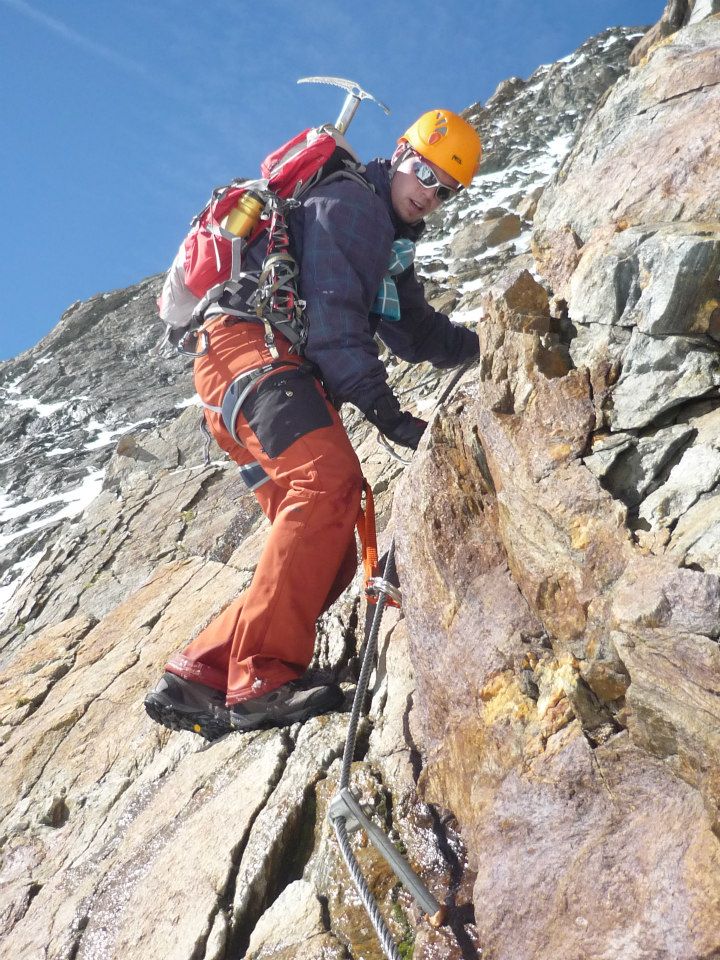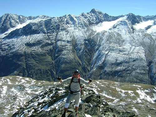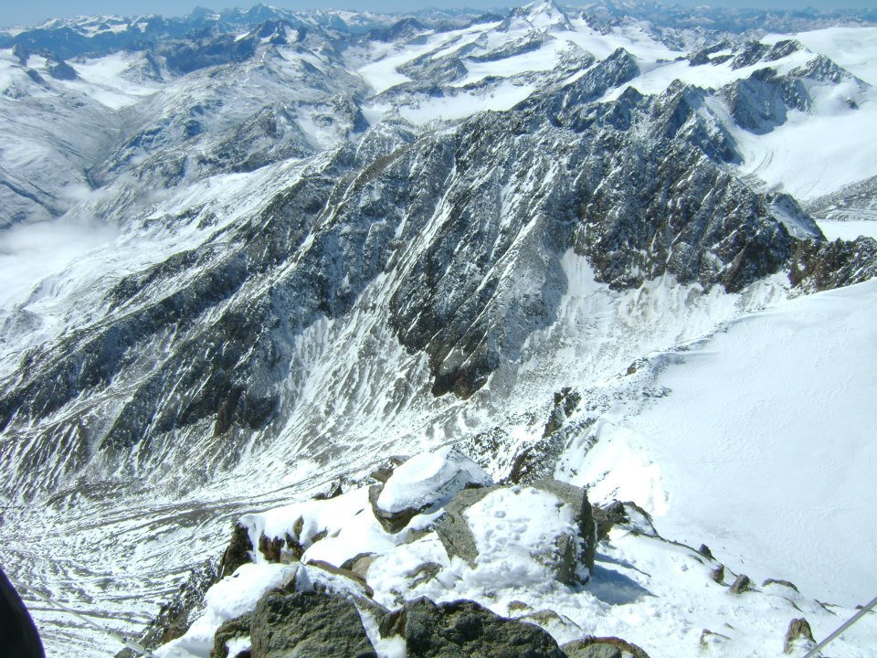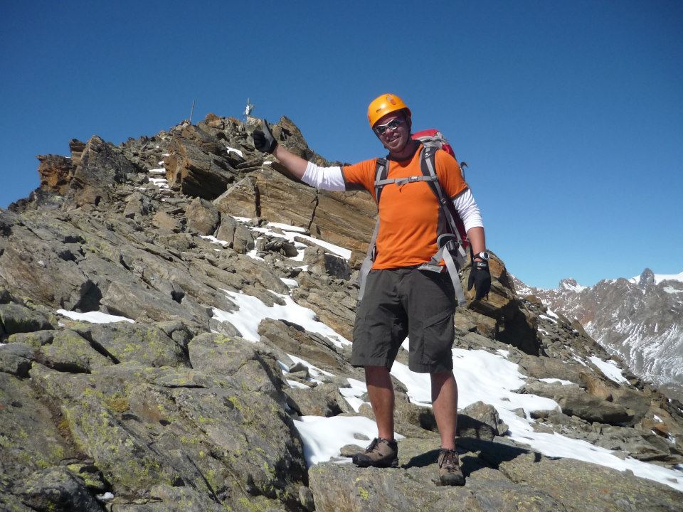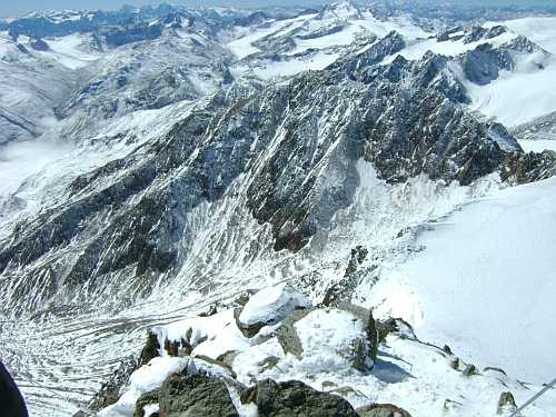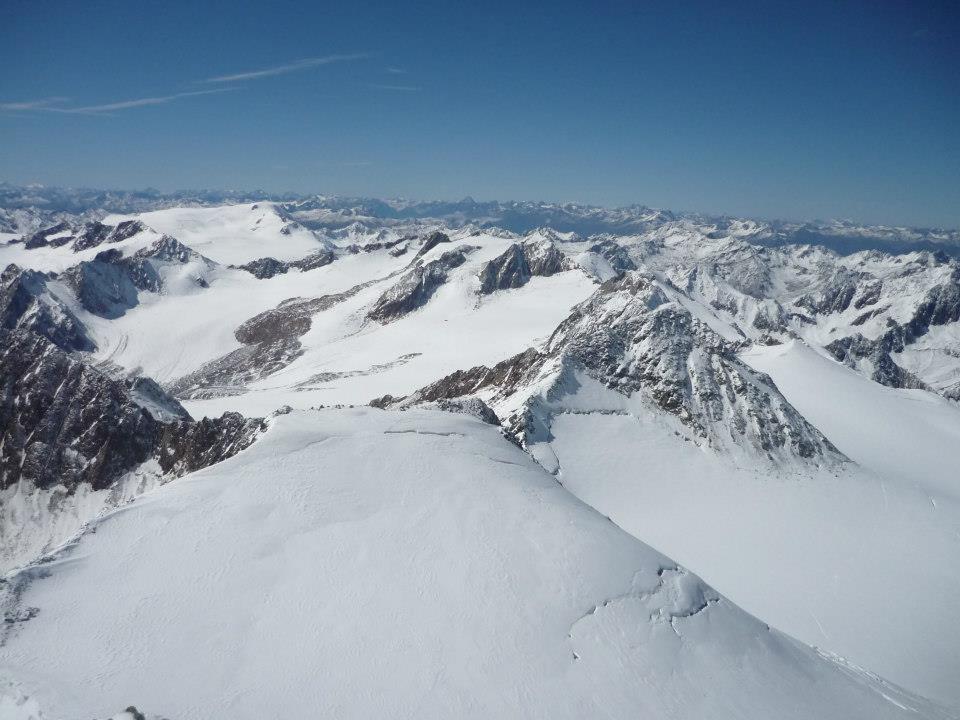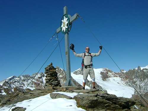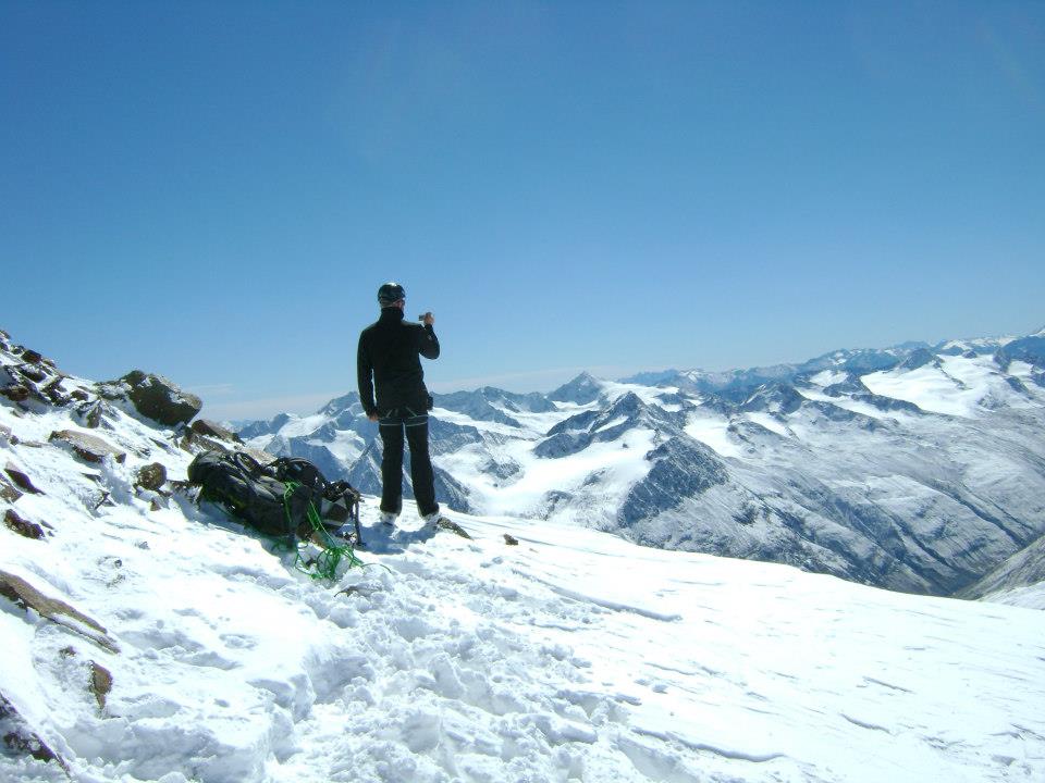 Teď už ale stojíme u vrcholového kříže a kocháme se pohledem na okolní vrcholy, které jsou i přes svou výšku pořád menší než hora na které stojíme my. Počasí nám přálo, vidíme skoro až na konec světa a sníh tomu všemu dodává ještě hezčí vzhled. Jsme nadšení a na vrcholu zůstáváme asi 20 minut.  Sestup je skoro horší než výstup, jelikož pořád vidíme, jak hluboko v případě chyby můžeme sklouznout. Ale menší hřeben rychle seběhneme, dále pokračujeme už zase navázání dolů po ledovci. I když sestupujeme, kvůli slunci a tajícímu sněhu se boříme, čím dál tím víc, cesta se tím stává pořádně  namáhavá. V momentě kdy se dostaneme k ferratě, sníh ze skály už odtál a my si tak užijeme lezení na mokré skále. Tento nepříjemný úsek, kdy strmý svah pod skálou doslova sjíždíme po zadku, nám dal zabrat. Na kamenech kde jsme čekali ráno, teď rozbalujeme Tyrolský špek a hodláme se na pár minut zdržet. Jelikož kameny jsou už bez sněhu suché, nějak se nám přestávka protáhla, válíme se zde a užíráme špek asi hodinu. Sluníčko nás příjemně ohřívá a ani jednomu se nechce jít dál. Teprve když sníme špek skoro celý, uznáme, že flákání bylo dost a začínáme sestupovat k chatě. Sníh už na slunci dost změkl, místy i i zmizel a my tak trochu bloudíme a hledáme cestu, občas tak projdeme i potůčkem z tajícího sněhu. To nám však nevadí, protože za chvíli už se nám boty vysouší v sušárně na Breslauer Hutte, přitom si dáváme AV menu (boloňské špagety) a plníme naše břicha dosyta.  Docela brzo se odebíráme do lageru a spolu s dalšími asi 40 nocležníky uleháme na matrace, kde rychle usínáme, protože ráno chceme vyrazit hodně brzo.