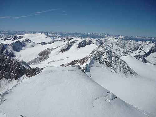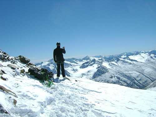 Vše jsme ale zvládli a nyní se můžeme kochat pohledem ze sedla na ledovec Taschachferner. Tento obrovský ledovec se ztrácí, ani nevíme kde a sněhové pláně se táhnou do nekonečna. Skupinky s vůdcem vidíme daleko před námi na ledovci. Navazujeme se na lano a vydáváme se v jejich stopách dál. I když je cesta vyšlápnutá, pořád se boříme, ale zatím jdeme na ledovci po rovince a moc nestoupáme. Vzhledem ke sněhu nevidíme trhliny, tudíž nepotřebujeme mačky, přesto jsme navázáni. Když se cesta stáčí ze severu zpět ke hřebenu pod Wildspitzi, začíná ledovec stoupat, tudíž i my nabíráme nadmořskou výšku. Vyšlapaná pěšina se kroutí mezi již viditelnými trhlinami a my zjišťujeme, že jsme prozatím vystoupali 1500 výškových metrů.  Čím víc stoupáme, tím víc začínáme být utahání – 10 metrů a zabíráme polohu v předklonu a hluboce dýcháme. Matěj dokonce na posledních 300 metrech (které mimochodem jdeme pěkně dlouho) několikrát zaujme pózu „já si tu lehnu na chvilku na záda a pokochám se“ a já tu chvíli rád využiju také k odpočinku. Do sněhu se už neboříme, jelikož se táhneme pod vrcholový hřeben. Poměrně vyčerpaní, konečně shlížíme dolů do údolí, kde jsme skoro celé dopoledne stoupali do Breslauer Hutte. Pod hřebenem vidíme složené baťohy a lana s další výzbrojí a proto také neváháme, vše nepotřebné odhazujeme, poněvadž každé kilo je znát, a my toho máme dost. Pouze s úvazkem a cepínem začínáme strmě stoupat po poměrně ostrém a exponovaném hřebenu na vrchol. Asi po 10 minutách tichého šplhání Matěj zjistí pro mě  dost nepříjemnou zprávu a to, že dole nechal foťák. Jelikož se oba shodneme, že lézt na vrchol a neudělat sto svých samolibých fotek v mnoho pózách nemá smysl, zamyslím se a dospěju k závěru, že mám asi o několik procent víc sil a možná vlivem nedostatku kyslíku pro něj seběhnu. Samozřejmě si pak nadávám, ale v půlce hřebenu na mě Matěj již čeká, dále již stoupáme společně.  Cestou potkáme sestupující dvojici, která se nás ptá – „Máte doufám mačky a lana?“ Naše odpověď je záporná jelikož jsme viděli, že si někdo nechává pod hřebenem, proto jsme to tam také odložili. Dostává se nám odpovědi „No to jsou naše věci, docela by se nahoře šikly“. Dolů už se nikomu z nás nechce, tudíž pokračujeme dál. Cesta není složitá nýbrž 30 metrů pod vrcholem je asi nejsložitější místo – skalnatý úsek, kdy je pod Vámi možná stometrová díra, vy musíte tuto díru překročit a držet se skály nad vámi. Matěj jde první a posléze mi radí, kam strčit ruku, jelikož nejsou vidět místa pro úchyt. Ačkoliv místo vypadá nepříjemně a složitě, nakonec se překonává bez problému i když jsme se trochu báli, že na sněhu uklouzneme.