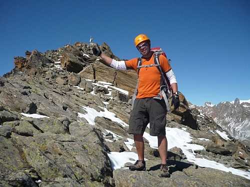 Zjišťujeme, že jsme se pokoušeli vylézt na jeden předvrchol, takže nakonec jsme rádi, že jsme se tam netáhli zbytečně. Jdeme už poměrně dlouho po travnaté plošině, když se rozhodneme zahnout a začít přímo stoupat na Mitllere Guslar Spitze. Nejdřív se drápeme do kopce, a pak balancujeme na příkrém suťovém svahu, kde doslova po čtyřech lezem nahoru. Pak už šplháme po skalnatých stupních. Skála se drolí, v jednu dobu dokonce držím kámen, na kterém Matěj stojí, aby ještě chvilku na skále vydržel a neulít spolu s Matějem dolů. Stěna naštěstí není tak strmá a leze se nám poměrně dobře. Asi po 40 minutách vylezeme na hřebenový vrchol, kde už skáčeme po kamenech až k vrcholovému kříži.  Z vrcholu vidíme další okolní hory, které jsou vysoké hodně přes tři tisíce metrů. Nejblíže vidíme skorou 3500 metrů vysoký Fluchtkogel, pod kterým je ve výšce 3.277 m.n.m. Branderburger Haus a a společně tak ohrazují obrovský ledovec  Kesselwandernferner.