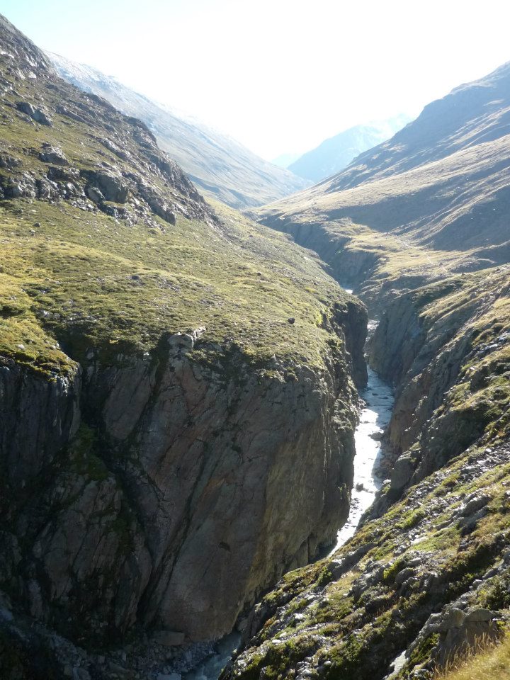 Pohled na tento ledovec pak před sebou máme celou dobu náročného sestupu, který je z vrcholu pořádně strmý, nohy i kolena dostávají pořádně zabrat. Využíváme každou rovnější travičku a sedáme na zadek, abychom ulevili nohám, které po dvou dnech už tolik neslouží. K chatě Hochjochhospiz se dobelháme asi až po dvou hodinách. Ihned do sebe klopíme pivo a polívku se špekovým knedlíkem. Pivo nám chutná a proto dáváme ještě jedno a spokojeně pokračujeme dál po pohodlné cestě nad potokem Rofenache. Když přecházíme jeden mostík, jsou za ním pěkné placaté kameny. Jelikož sluníčko ještě pěkně hřeje, lehneme si na ně, ať si protáhneme záda. Asi na půl hodinky nakonec usínáme, a kdyby kolem nás nechodili další cestovatelé, spíme tam dodnes.  Přesto nám spánek nám dodal energii a tak rychle pokračujeme dál.