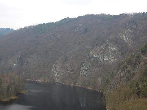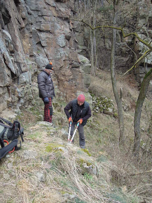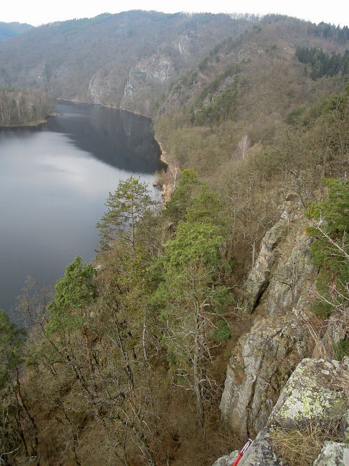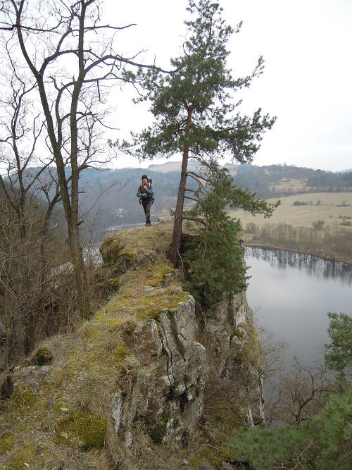 Tentokrát padla volba na Pakostu. Chtěli jsme si zalézt a využít toho, že kluci už tam byli a znají přístup. Ha chyba, už je to trochu dýl, takže až třetí odbočka je ta správná. Autem po silnici č. 118 do Zduchovic, na Žebrákov, minete odbočku vpravo do lesa se zákazem vjezdu a další štěrková polňačka vpravo už vede správně do cípu louky u lesa. Dál pěšky levou lesní cestou a pěšinou na hranu svahu nad Vltavou, pod kterým jsou skály.