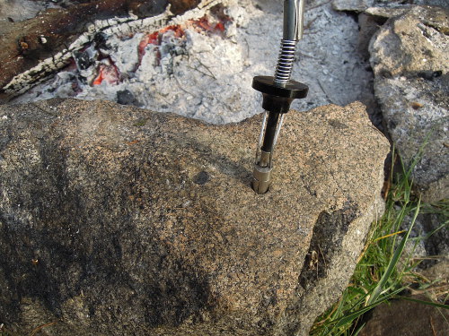 Nejprve jsme s Jirkou vyzkoušeli RB v žulovém lomu na Vltavě (testujeme ten nejmenší 1/2"). Nejdříve teoreticky u poradního kruhu a poté jsme našli další vhodnou předvrtanou dírku v kamení pod skálou. Jak se vlastně umisťuje a kterak ho vyndat? Do díry jde dobře, vyndat hůř (je třeba praxe).