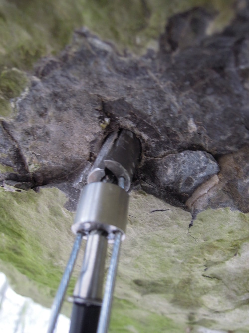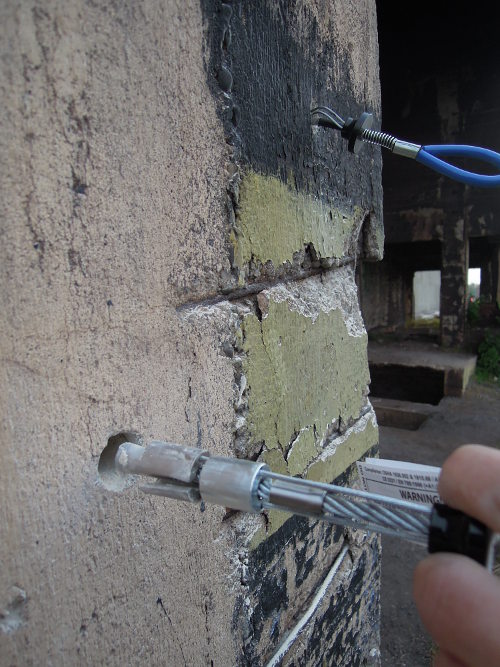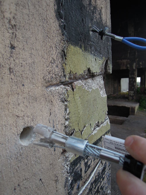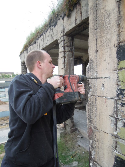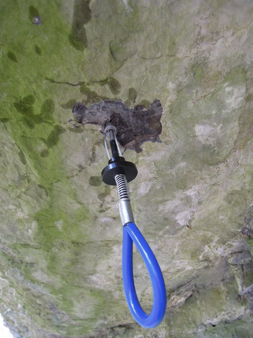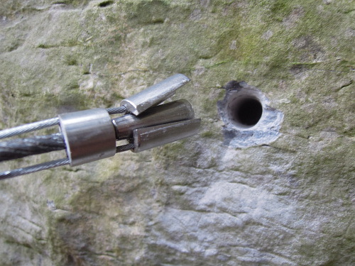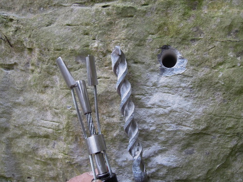 1) Při prvním pokusu jsem díru pro RB 1/2" (průměr 12 mm asi 4 cm) navrtal do vápencového "stropu", přičemž se okolo díry odlomila část vrchní slupky kamene tlustá asi 4 mm (kterou jsem po skončení akce zalepil i s vrtem). I tak v (lehce očištěné) díře friend vydržel, když jsem se na něm houpal delší dobu i se zátěží - nářadím, celkově asi ke sto kilům váhy. Samotné vrtání i založení bylo rychlé, lanko táhla spolupracuje ve všech směrech zatížení.