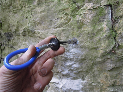 K otestování ve skalní stěně jsem poté vybral další víkend nevýznamné bezejmenné vápencové skalky v lese, a vskutku, stačí krátká cca 4 cm hluboká dírka, jen aby se opřely klínky. Proběhla i teoretická příprava, každá ze tří velikostí RB má svůj návod, pozor doheldané parametry se na různých webech mohou lišit. Zmiňovaný RB jsem loni občas nosil po různých skalách, ale na moc převisů či hladkých stěn jsme nenarazili. Poté jen jedinkrát jsme použili RB při dělání cesty zdola v jednom hladším místě nad převisem, ale nakonec se ukázalo, že nejmenší skobička by tam asi šla.