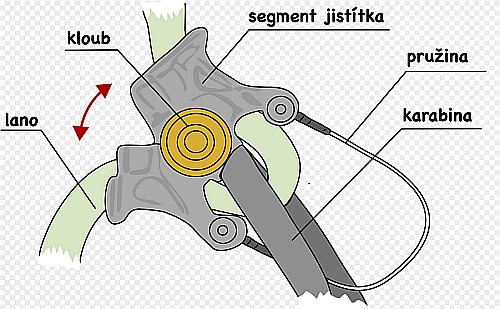 Při rozevření (jak naznačuje šipka) stisknou dva třmeny (výstupky) lano o karabinu