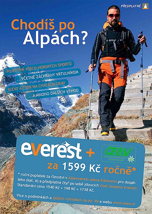 Ještě než se pustíme do samotného obsahu, dovolíme si Vám představit největší novinku a totiž balíček ročního členství v rakouském Alpenvereinu spolu s předplatným Everestu za zvýhodněnou cenu 1599,- Kč. Připlaťte si pouhých 59,- Kč a máte čtení na celý rok. Alpenverein jistě netřeba představovat, nicméně veškeré podrobnosti, podmínky a především objednací formulář naleznete na http://oeav.cz