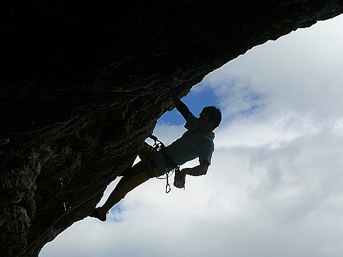 Hueco, 7b + Krásná převislá a vytrvalostní, po oblanech na konci.