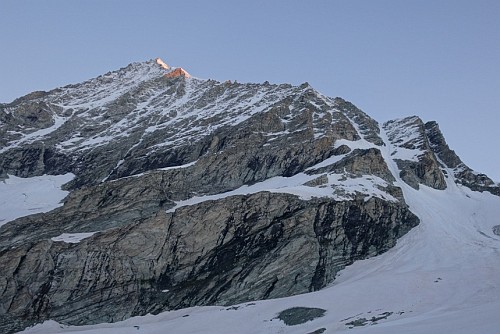 Nad chatou začíná cestička, po které se dostanete ke kraji sněhového pole a po něm ke skalnímu prahu na spodním okraji ledovce. Odtud už krásně vidíte východní hřebínek Weisshornu, kam se musíte dostat. Buď po skalním žebru vlevo od ledovce, nebo – jak jsme zvolili my – po ledovci až k výraznému sněhovému žlabu a jím pak nahoru. Malý problém byl, že žlab měl sklon tak 50-55 stupňů a šustila jím zrovna jedna lavina za druhou. Když spadal všechen sníh, začaly pro změnu pršet kameny. Poučení číslo dvě: Čím později vyrazíte, tím víc toho na vás padá. Ideální je dostat se ke žlabu ještě před svítáním, tj. vyrážet max. o čtvrté. Nebo jít klasickou cestou, ne žlabem. Žlab je, jak klasik praví, sice delší, ale těžší a nebezpečnější cesta. (Nám se ale zalíbila tak, že jsme ji druhý den dali znova :-))