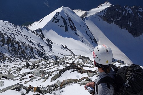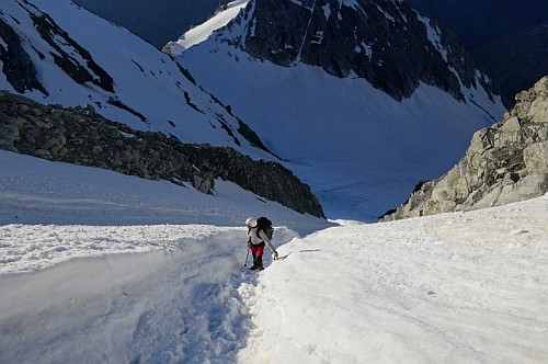 Střídáme se, postupujeme nahoru a hlavy máme vyvrácené nahoru, jak číháme na další šutr. Neboříme se už tolik, jako včera, protože jsme mnohem lehčí a sníh je teď ráno o dost tužší. Ideální pro oporu jsou hůlky, pomáhají v tomto terénu víc než cepín. Jen lituju, že mám u nich moc malé terčíky, často je utopím až po lokty do hlubokého sněhu. Teoreticky by se tu dalo jistit, pokud bychom tu a tam nacpali do sněhu nějakou tu kotvu, ale ani nás to nějak nenapadne. Ostatně terén dovoluje v pohodě proklouznutí a bezpečné zastavení předními hroty maček. Dobrých maček!, s turistickými by se člověk dávno válel dole na ledovci. Žlab se několikrát rozvětvuje a my se pořád držíme vlevo. Ke konci je žlab ještě strmější a plný ledu a šutrů, přecházíme tedy raději na stabilnější skalnatý terén vlevo od žlabu. Docela rychle jsme pak na hřebínku, po kterém vede naše další cesta.