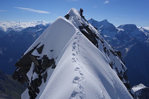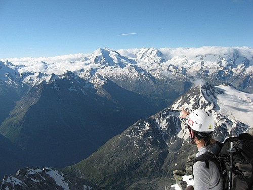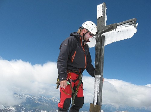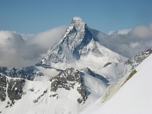 Na vrcholu se zdržujeme jen krátce, počasí přece jen začíná hrozit. Ani podmínky pro focení nejsou ideální, i když nám občas mraky umožní nějaký ten nádherný pohled. A že jsou to nádherné pohledy! – ostatně: kolikrát za život se vám podaří vidět Matterhorn zeshora? Trochu tu tedy posvačí me, nafotíme vrcholové foto, tiše poděkujeme hoře a začínáme pomalu sestupovat.