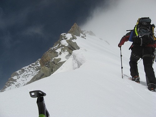 V místech, kde jsou převěje, jdeme níž a v převěji se přijišťujeme cepínem. Hodily by se dva, ale druhý jsme si chytře oba nechali na chatě. No nic, možná někdy příště. Cestou je i několik krásných lezeckých partií, malých věžiček, které lehce zdoláváme a vesměs tu nacházíme i kruhy pro slanění při zpáteční cestě. Jen jedna vyšší věž (Je u ní pamětní deska) se lehce obchází a leze zleva, je to pohodlnější. Moc výškových metrů nepřibývá, ale cesta je tak náročná, že jsme utahaní jak psi. Na konci přibývá sněhu a hřebínek přechází v sněhové plató, pozvolna víc a víc nakloněnou severovýchodní stěnu. To už si můžeme na chvilku oddychnout, vizuálně je to tu o fous bezpečnější. Oběma je nám ale jasné, že jestli je něco nebezpečnějšího než hřebínek, je to hřebínek cestou zpátky! Počasí, které bylo doteď velmi ohleduplné, se začíná chvílemi trochu kazit a je nám jasné, že může brzo nastat závod o čas.