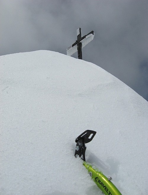 Moc se tedy nezdržujeme a vyrážíme při kraji stěny ostře vzhůru. Kopeme chvilku schody do nebe, když tu Radúz zajásá, že vidí kříž. Nějak se mi to nezdá, čekal bych ještě pár set metrů – a ovšem, byl to planý poplach. Když přijdeme blíž, vidíme po levici jen nějaké technické zařízení s anténou. Zato když se na chvilku rozeženou mraky, konečně uvidíme vrchol. Musíme se ale tak zaklonit, že málem přepadneme na záda, je tak neskutečně vysoko, že je to až demoralizující. Terén je sice už výrazně lehčí, sněhový svah 45 stupňů (jen místy do 60 st.), ale sil povážlivě ubylo. Tedy mě určitě, takže začínám trochu zvolňovat tempo. Přece jen je trochu znát rozdíl dvaceti let a horší fyzička :-( Po nekonečných 300-400 výškových metrech pak konečně dorážíme ke skalnaté vrcholové pyramidě s křížem.