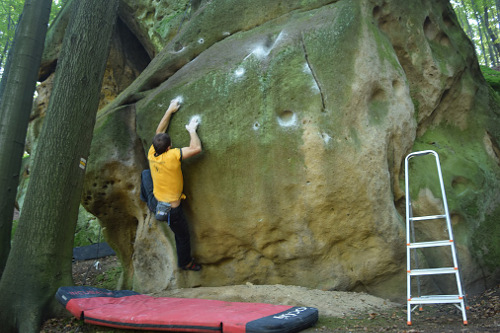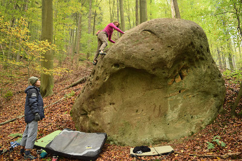 Kameny v oblasti jsou z pískovce – kdo někdy bouldroval na Chřibech, jistě ví, že se tejpovací páska na prolezená bříška prstů hodí a oceníme šetrný přístup k místy křehkému materiálu. Fontainebleau už na Moravě asi nenalezneme, nicméně pevně věřím, že  si v případě dobrého počasí užijete nádherou chřibskou přírodu a rozmanité boulderové problémy.