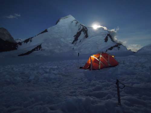 Do C3 mezitím dorazili Matěj a Rakušani a nás čekají gratulace k vrcholu. Jsem opojen radostí, ale zároveň i na konci sil, ani nejím, nepiju a jdu si zalehnout do spacáku. K večeru se probouzím, když mě plachta od stanu začne opleskávat po tváři. Venku se rapidně zhoršilo počasí, začal padat sníh a foukat silný vítr. Mám žízeň a dozvídám se nepříjemnou novinu, že díky těžko pochopitelnému nedorozumění během rádiového spojení předešlého večera mezi Nimou a průvodcem Rakušanů v C2, Matěj vzal na jejich pokyn jen láhev kerosinu a vařič nechal dole. Tak teď tu máme dva litry kerosinu a můžeme se s ním maximálně tak vyfotit, vodu ze sněhu nepřipravíme. Nepřikládám tomu příliš důležitosti, Matěj snad dostane nějakou vodu od Rakušanů, až s nimi půjde nad ránem na výstup na vrchol a já budu druhý den přeci scházet, tak to nějak vydržím.