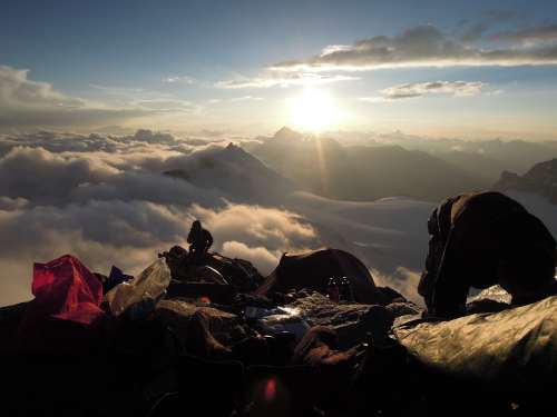 Další den nás čeká ta samá cesta, tentokrát už ovšem sbalíme kompletní tábor k přesunu do C2. Rakušani si dávají odpočinkový den a zůstávají v C1. Do C2 dorazíme během odpoledne. Tábor se nachází na hřebeni a teprve teď, když máme postavit dva stany, tak mi dochází, jak je hřeben úzký. Z jedné strany zledovatělý svah o sklonu dobrých 70 stupňů, z druhé strany několikasetmetrový kolmý sráz. A uprostřed zhruba tři metry široké suťoviště, kam máme vtěsnat stany. Přes hodinu přehazujeme kameny, abychom vytvořili vodorovné plošiny pro stan. To se nakonec jakžtakž podaří, nicméně okraj našeho stanu je půl metru od srázu, který je navíc dost zvětralý a nevypadá tedy nějak extra stabilně. Jsme s Matějem z toho nervózní a do ledového svahu zavrtáváme šrouby a zřizujeme jištění, ke kterému se na noc připneme. Nicméně výhledy z tohoto orlího hnízda jsou neskutečné, a když se k tomu přidá nádherný západ slunce a hluboká údolí pod námi zahalí mraky, jsme nakonec z tohoto místa nadšeni.