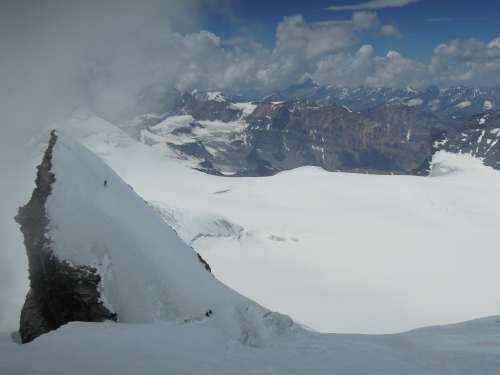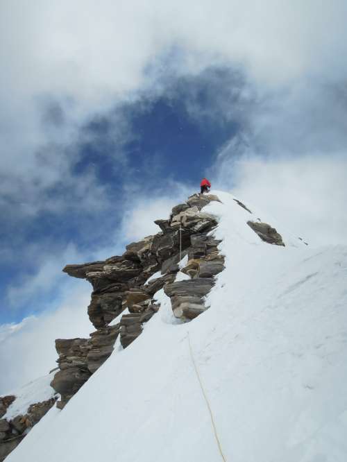 Stáváme ve 2:00. Hodím do sebe čokoládovou tyčinku a obleču všechny věci, co mám. Venku vládne pěkná zima ještě umocněná občasnými závany větru. S čelovkami vyrážíme po připravených fixech. Na konci fixu vybalujeme další lano a já připravuji jištění. Se zaměstnanýma rukama si chci přidržet kus lana pusou, ale místo toho se zakousnu do svého jumaru. Okamžitě mě k němu přimrznou rty a jazyk. Instinktivně jumar od sebe odtrhnu a cítím, jak s ním trhám i kousek rtu a povrchu jazyku. Bolí to jako čert a plivu plno krve ale nemůžu si nevzpomenout na komickou scénu z filmu Obecná škola, kde nezbedným žákům přimrzly jazyky k zábradlí. Stoupáme dál a mě se přidá další problém. Začínají mě mrznout prsty u nohou a chvílemi je přestávám cítit. Začíná už sice pomalu svítat, ale přihnala se oblačnost a vyhlídka na slunce je tedy značně nejistá. Začínám mít o své prsty značné obavy. Radím se rychle z Franckem, který si již omrzliny jednou prodělal a nyní má kvůli tomu na sobě boty dimenzované na Mount Everest za 1100 EUR. Nakonec si řeknu, že prsty kvůli zdolání vrcholu riskovat nebudu, Franckovi předám poslední kotouč fixního lana, co mám v batohu a obracím se zpět. Po pár krocích ovšem vykoukne poprvé sluníčko, laskavě mě pohladí po tváři, poryvy větru na chvíli přestanou a já se otočím a začnu zase stoupat. Terén je dost náročný, firnový a občas zledovatělý čtyřiceti až padesátistupňový svah a nám dojdou fixní lana. Dosud čistě zasněžený svah však nyní začne být protínán skalními žleby a stupni a na nich se objeví fixní lana z přechozí sezóny. Pokračujeme tedy po nich. Začíná mi ubývat sil a opět zvažuji, že se otočím, když najednou uvidíme závěrečný sněhový hřebínek a za nim už vrchol. Na vrchol dostoupáme v 11:30. Mísí se ve mně obrovská radost, ale zároveň i jakási otupělost a pomalost myšlení, což předpokládám je způsobeno nedostatkem kyslíku. Na vrcholu je jasno, ale bohužel všechno pod námi je v hustých mracích a výhledy tedy spíše připomínají pohled z letadla než z vrcholu hory.