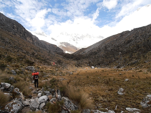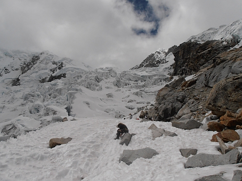 Od místa, kde nás vysadil autobus, jsme pokračovali asi 200 výškových metrů do předsunutého bejzu, který byl však dost nízko a rychle dosažen, a tak jsme po krátkém románku s místníma krávama pokračovali zas nahoru. Jelikož jsme měli s sebou jídlo asi na 9 dní, schovali jsme asi půlku z toho pod šutr v morénovém údolí kousek od přesunutého bejzu. Cesta poté pokračovala typickým skalnatým reliéfem až do pravého (či možná advanced) bejzu ve výšce asi 5000 m n.m., kde jsme rozbili tábor.