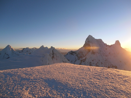 Úspěšný výstup na 6354 m n.m. vysokou Chopicalqui, neúspěšný pokus o Huonday (6395 m n.m.) a následný výstup na domimantní horu Pisco (5752 m n.m.) odkud máte krásný výhled na Alpamayo a Artesonraju - horu co každý vidět mnohokrát v kině na logu Paramount Pictures.