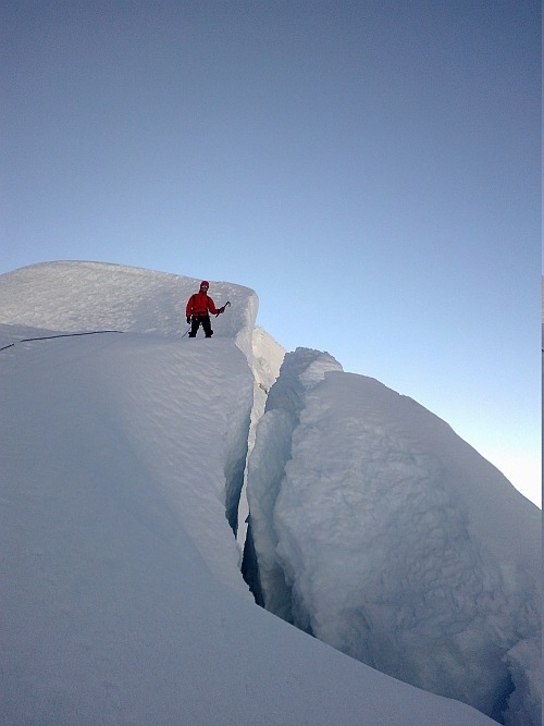 Druhý den ráno byla mlha, jak mlíko, ale postupem času se začala vytrácet, a tak jsme přibližně ve dvanáct vyrazili nahoru do C1. Věděli jsme, že by to nemělo být daleko navíc teploty se celou dobu díky mírné oblačnosti drželi pod bodem mrazu, a tak nebylo kam spěchat. Měli jsme informaci, že na původní cestě spadl sněhový můstek přes jednu trhlinu, a že bychom se měli vydat někam doprava, abychom to obešli. Takový byl plán, který se avšak úplně nevydařil, jelikož jsme šli nahoru sami a nevěděli jsme, kde máme tedy odbočit, a tak jsme nakonec neodbočili a skákali jsme asi přes metr a půl širokou a asi 15 m hlubokou trhlinu. No, byla to prdel :) ale, když vás u toho někdo jistil, tak to rozhodně nebylo nijak nebezpečné. Trasa byla celou dobu plus-mínus zřejmá a viditelná, a tak jsme asi po třech hodinách dorazili z bejzu do C1 ve výšce přibližně 5450 m n.m.