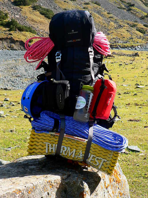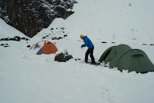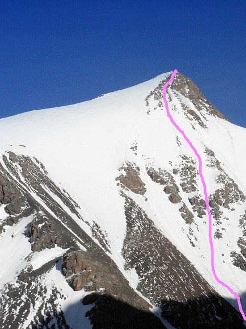 A ještě Pik Palestra. Ve dvojce lezený boční výrazný vrchol, fšecičko to v dolině Kosh Moynok. Štít 4.930 m, jméno neměl, už má. Ale tady nešlo ani o tak jméno nebo vrchol, spíš o cca 1000 metrů vysokou severovýchodní stěnu. Pokus o diretku se nepovedl, kapku hodně nasněžilo (rosničku na počasí jsme sežrali). A terén byl nepřehledný, rozlehlá stěna k bloudění jako dělaná. I šutry padaly, což zase tak moc nevadí. Všichni nosili kulichy. Na druhý pokus, po zdlouhavém sestupu, už pustil kuloár v pravé části stěny.
