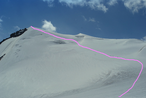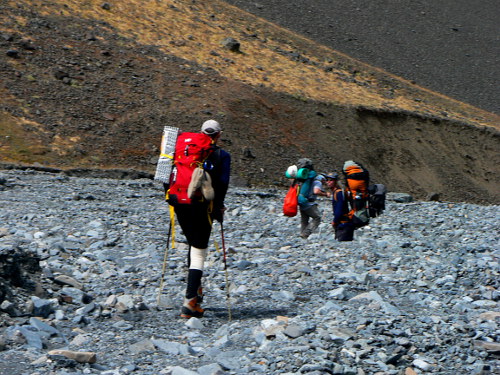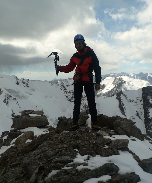 Z bejzu šlapačka kolem hodinky, plazením po velikém ledovcovém splazu. Nekonečná suť, jako na staveništi. Ale i tak výška přibývala. Hupky šupky  z ledovčíka na levý hřeben morény (neplést s murénou), oddělující ledovec údolní od menšího, ve východní dolině rozcapeného. Pak volně a lehce na suťová pole. No, lehce, malá aklimatizajda by se šikla. Počasí bylo skvělé, nebylo kam spěchat, takže pauza na hostinu. Bohatou, přece do paštiky dávají úplně všechno. Snad jen roh z bejka do plechovky nenacpete. Sice inverze z údolí se začala trochu nasouvat výše do doliny, i tak jsme rychle postupovali, s výhledem jak z klajn matrhornu. Trasa pro blbce, nejprve k jihu, pak k severu, dál už k jihozápadu. Vrchní konec kopce měl rozbitou a zvětralou východní stěnu a s ledovým krunýřem od severu, bohatým na velké trhliny. Snížek bílý, bere síly. Svážek kolem 45 stupňů. A zase trhliny, ale špice neodolala. Výhled jak z VIP lóže, kolem Alaj se Zaalajským hřebenem Pamíru. Padla mlha a bylo dokoukáno.