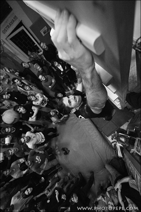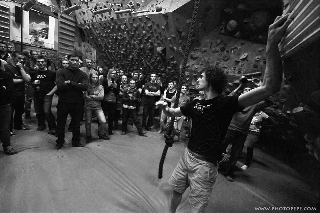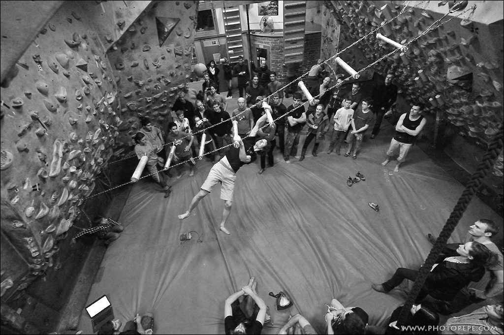 Jako každý rok jsme požádali Adama, aby se s námi přijel podělit o to, co prožil a dokázal v uplynulém roce, a zároveň nás napadlo, že bychom mohli přednášku něčím zpestřit – tedy napadlo to Pepeho, který se náhodou zúčastnil jednoho z brněnských desetibojů - tréninku Adama a dalších borců na campusu. Kluci už to delší dobu pojímají jako závod… Pepe z toho měl takový zážitek, že si chtěl hned po příjezdu domů vyrobit campus – po několika dnech ho to ovšem přešlo – škoda :). Oslovil tedy Adama, jestli by mu nevadilo udělat desetiboj takto veřejně, a Adam souhlasil.