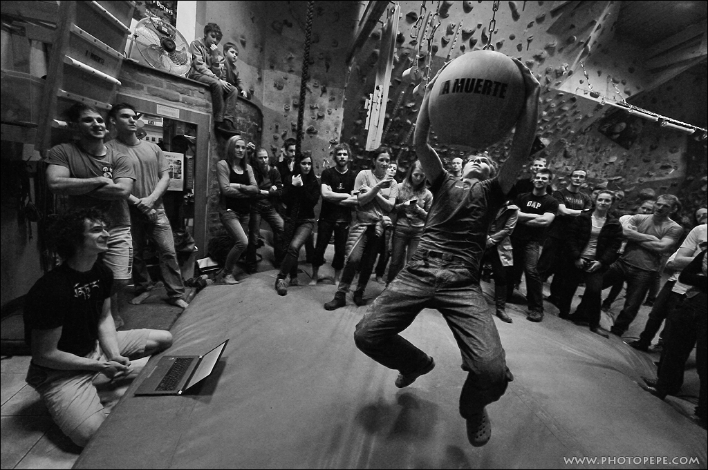 No ale zpět… Mučící přístroje z dílny A MUERTE – mně to ale spíš připadalo jako vánoční výzdoba bouldrovky - jsme nainstalovali spolu s Pepem, Vencou a Kofčou už odpoledne a Adam přijel vše zkontrolovat a vymyslet 10 disciplín – náš desetiboj se v několika disciplínách od toho brněnského odlišoval…