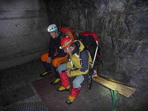 Původní plán byl spát tady, ale asi poprvé v životě nám jde v horách něco nad plán a jsme tu už v 10 ráno. Tak dáváme něco k jídlu a k pití a mažeme třetím sněhovým polem do rampy. Ta by měla být celkem lehká až pod wasserfall kamin. Občas se tam musí popolézt, tak horní část už lezeme od štandu ke štandu.