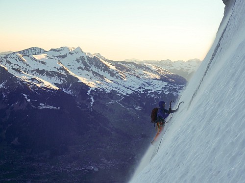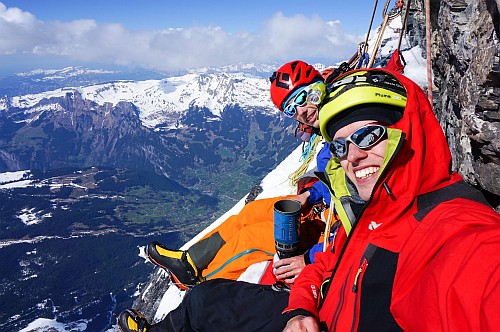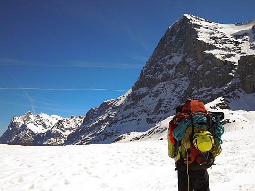 Celá stěna je luxusně vysněžená, tak stavíme stan na Eigergletscheru a zevlujeme na sluníčku. Za chvíli se u nás objeví dva rakušáci a vyzvídají, jestli prý jdeme do severky. Tak jako říkáme, že jo, a on že oni taky. Tak jsme si říkali, že dvě dvojky ve stěně, to je pohoda. A pak rovnou dodal, že jdou ještě asi další 4 dvojky. Docela nábuch na úterý. No nic, jdeme spát s tím, že ráno vstanem brzo, abysme někde nezkejsli ve frontě.
