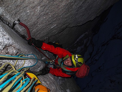 Asi ve tři ráno jsme u nástupu do stěny a nad námi už jsou vidět čelovky, tak úplně moc nespěcháme. Asi za hodinu luxusního rubání firnem jsme u Stollenlochu (tam co jsme to minule balili). Vytahujeme lana z batohů a hrneme to k těžký spáře. Tady by mělo začít lezení, ale jak říkal Plizi: Těžká spára není zas tak těžká a už vůbec to není spára :D