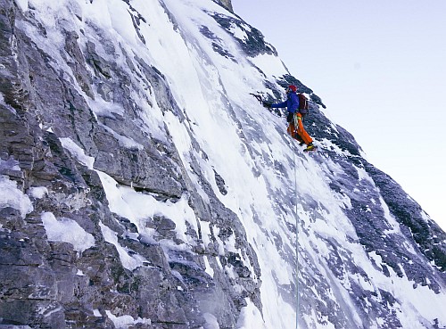 Dál je na programu pavouk - poslední ledové pole stěny a na jeho konci ještě pár lezeckých úseků okolo Cortiho bivaku. Dáváme oraz a vyhlížíme do napůl vyledněného žlábku. Když tu chybí led, tak to opět musí být intenzivní zážitek. My to máme naštěstí pod ledem alespoň z části, a tak se po půlce délky dá něco solidního vrtnout.