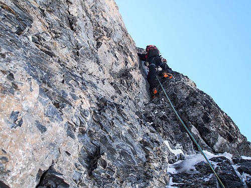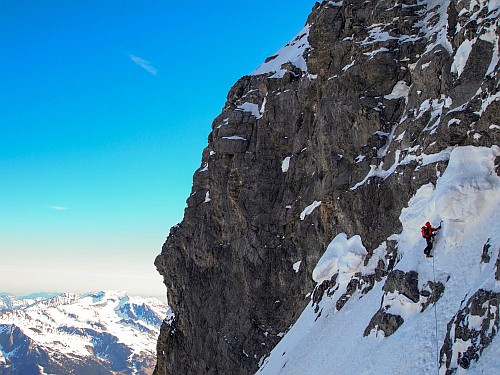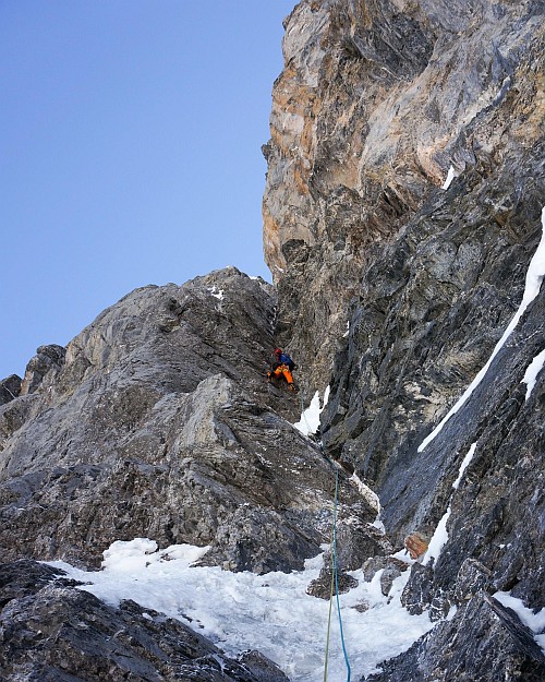 luxusně exponovaná plotna s fixem, přes kterou valí prašan z horních částí stěny. Na konci fixů dobírám a Vejvis frčí přes první sněhové pole někam do středních částí Eisschlauchu. Střídáme většinou, když jednomu dojde matroš, nebo už to hodně dře a tak Vejvis štanduje v erár skobách a dobírá mě. Celkem si libujeme, jak jsou ty plotny pěkně pod ledem, že v létě to musí být zlo.