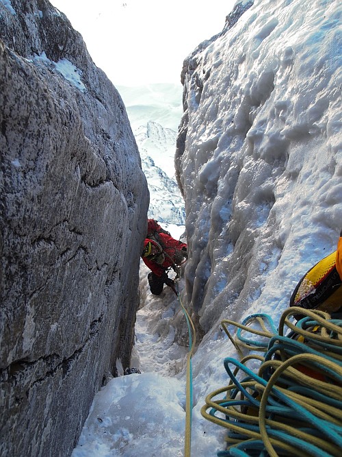 Další délka - ice bulge je zakončená komínkem, kde je z jedné strany skála a z druhé led. Není to zas tak těžké lezení, ale protrápit to s batohem na zádech dá zabrat.