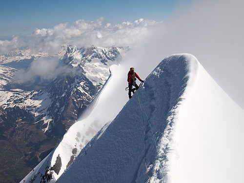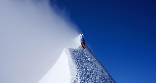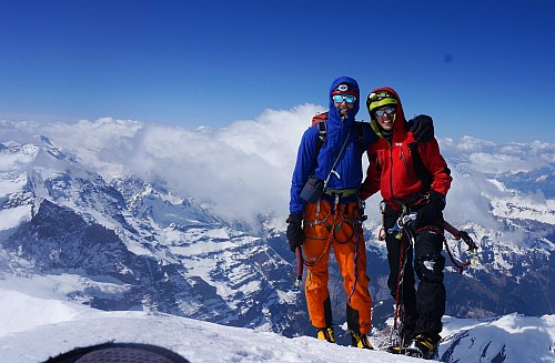 Potom už zbývá asi jen délka a půl lehčího mixu a jsme ve vrcholovém firnovém poli. Oba máme neskutečnou radost, že teď už to asi fakt na vrchol klapne a hlavně, že už nás nic těžkého nečeká. Užíváme si luxusní expozici na hřebínku Mittellegi a fotíme ostošest.