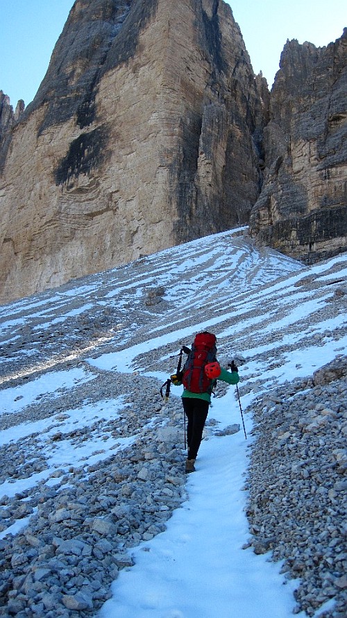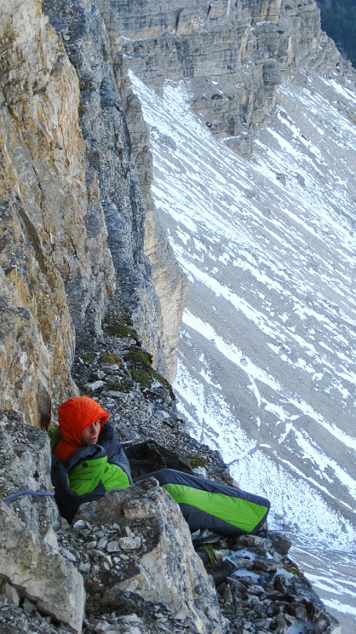 Nic naplat, poslední šance na ostrý pokus je začátek září, protože svědomí si Honzu Zbranka vyžádalo na oficiality horosvazu na festivalu v Teplicích. Mladí alpinisté z obavy ze zimy nebo z nedostatku vhodných spolulezců nabízené místo v autě nevyužili, a tak bafuňáři odjeli sami. Junioři vlastně dobře udělali. Kolem Tre Cime nasněženo, ukloněné partie stěny lehce zaledněné. Kosa jako prase. Dny krátké, noci dlouhé a studené. To abychom si přibalili teplé spodní prádlo. A raději i oteplovačky a péřovky. Potřeba bude i morál, mádžo a hodně síly. Cesta je jištěná tak, že skoby jsou často daleko níž, než končí nohy, severní stěna Cima ovest je vlhká, lámavá a hodně převislá.