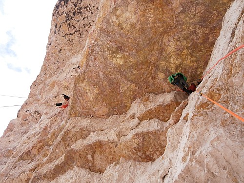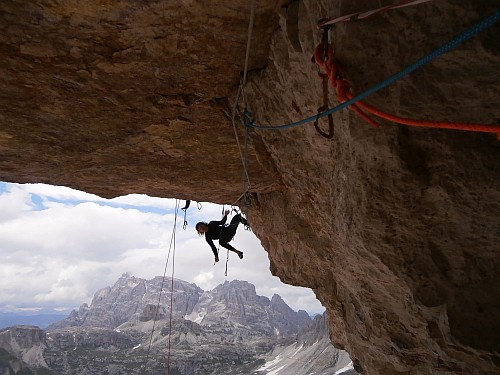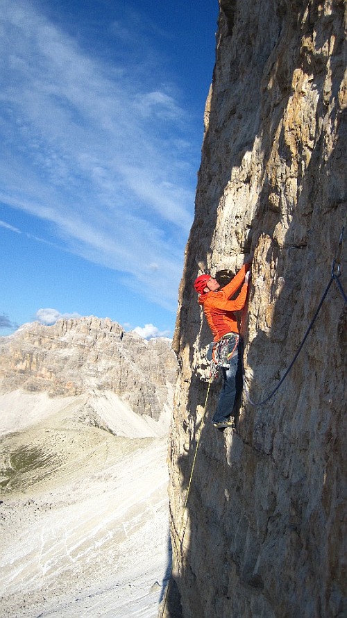 Velký převis na Cima ovest volně. A pak, že ty srazy k ničemu nejsou! Zaneprázdnění bafuňáři však strávili léto jak jinak než papírováním a od výjezdů typu na jeden a půl dne do Dolomit nelze žádné velké výsledky čekat. Ideální podmínky, které letos v Alpách kralovaly, zatím vyzobali další a jeden z absolutně suchých týdnů na Tre Cime byl strávený prvním soustředěním s pilotně  sestaveným juniorským družstvem komise alpinismu ČHS na ne až tak suchých skalách v Orcu.