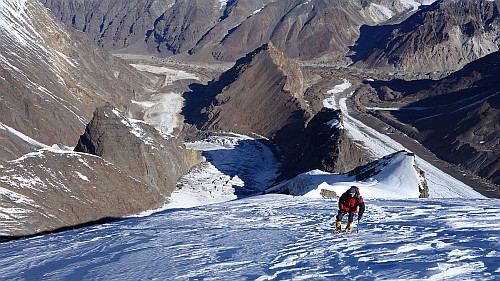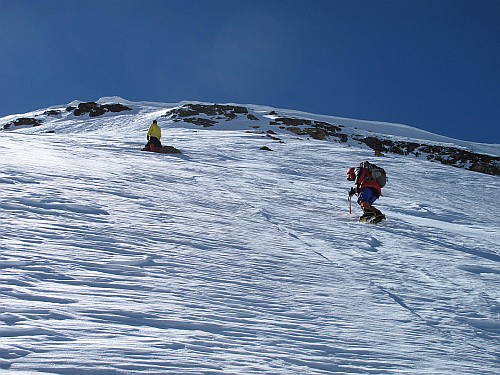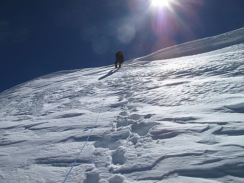 Záběry z vrcholového dne, sklon svahu k 50° a desky tvrdého sněhu. Pod vrcholovou převějí sklon svahu ještě přitvrdil k 60°, s cepínem a posléze i lanem jsme se cítili lépe.