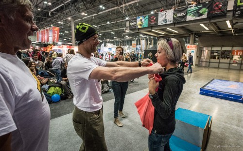 Přestavba mezi ženským a mužským finále zabrala stavěčům přibližně padesát minut, takže kdo chtěl, mohl si po pavilonu zajít vyzkoušet alespoň některé z aktivit doprovodného programu. Ať už drytooling, lanové aktivity, nebo třeba „Shopping“